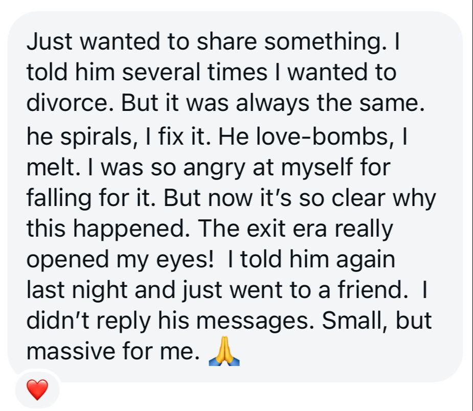 The Exit Era™ prepares you for the moment after the truth is spoken; the moment where love-bombing, guilt-shifting, and sudden promises can pull even the strongest woman back into a pattern she's already outgrown.